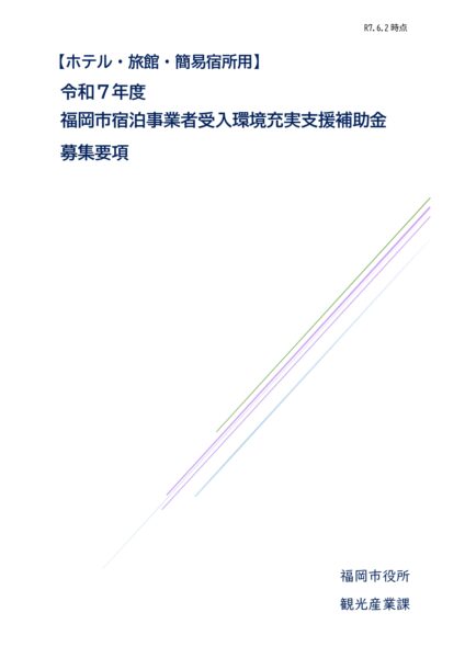 福岡市が実施する、宿泊事業者受入環境充実支援補助金【ホテル・旅館・簡易宿所用】の公募が令和7年6月2日(月)から開始されました。